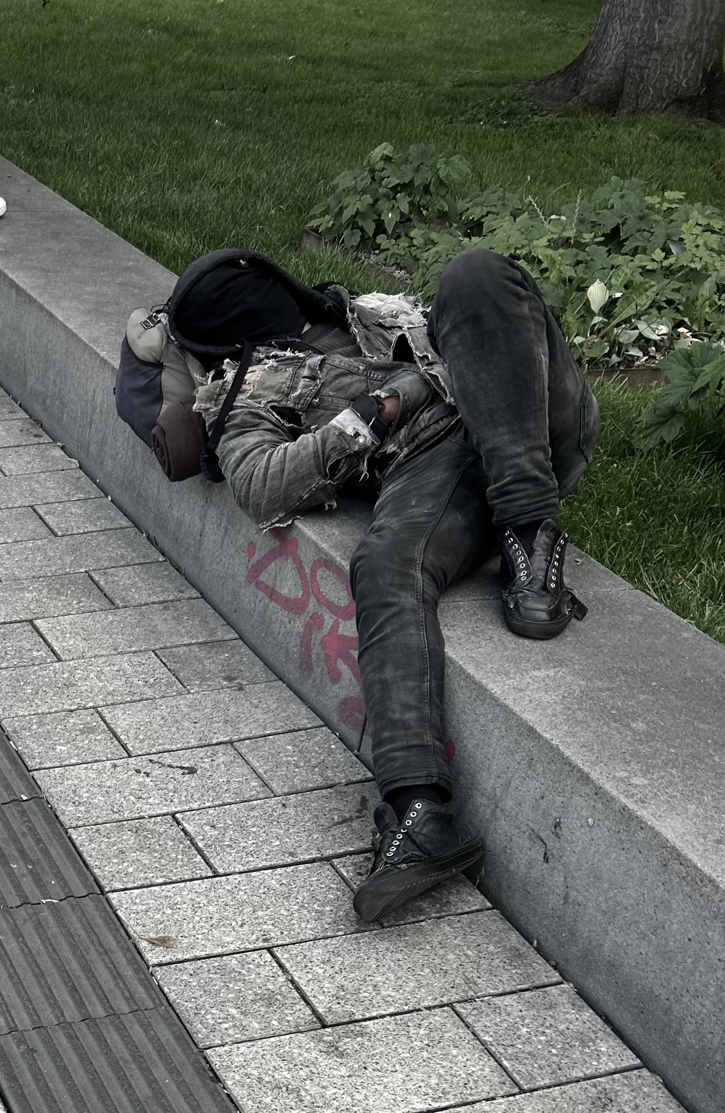 The bench he was lying on was covered in graffiti. It looked like a place where people normally wouldn’t linger long-but for him, it might have been the only shelter he had at that moment. His clothes were worn, his shoes nearly falling apart. And yet, he looked surprisingly calm. Peaceful, almost as if he had come to terms with the restlessness of the world around him. I don’t know his story. But as I stood there watching, I wondered who he used to be before life brought him here. Maybe he was a musician. Maybe a student. Maybe he had just lost too much- someone he loved, a job, or eventually just his grip on stability.